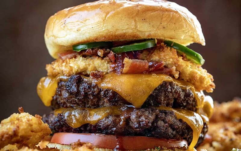 Una verdadera hamburguesa Rodeo para hombres con una jugosa hamburguesa de ternera, bacon crujiente, queso cheddar, pepinillos, lechuga fresca y