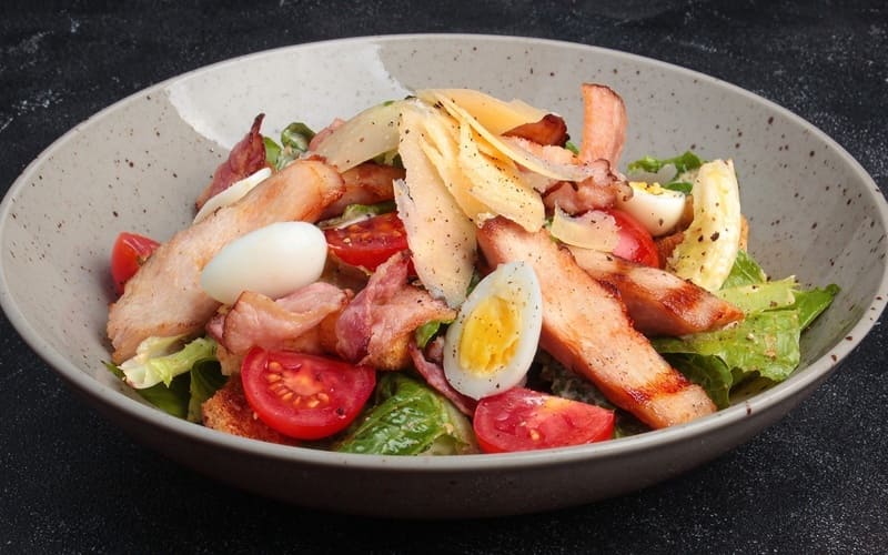 Una ensalada César ligera y nutritiva con tierno pollo a la parrilla, crujientes hojas de lechuga iceberg, aromáticos picatostes, parmesano