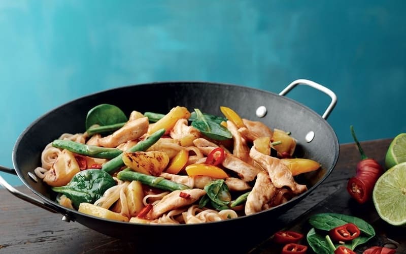 Un aromático wok de pollo con jugoso filete de pollo, verduras frescas (brócoli, zanahoria, pimiento, cebolla) y salsa de soja