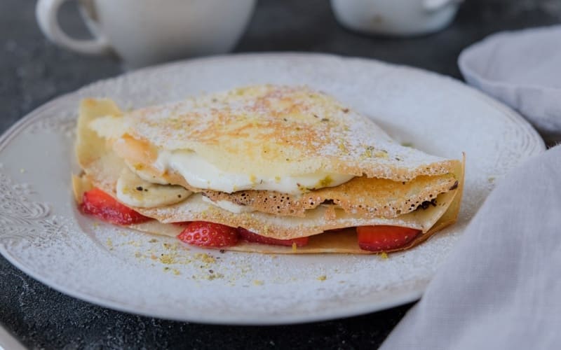 Tiernas crêpes con diversas rellenos dulces: requesón con pasas, manzanas con canela, cerezas. Se sirven con crema agria o su