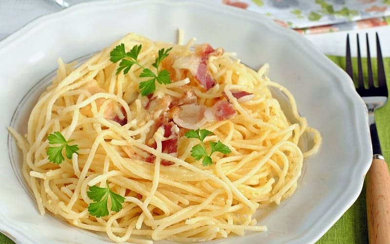 Cremosa pasta Carbonara según la receta clásica italiana: espaguetis, panceta o bacon frito, yema de huevo, queso parmesano y pimienta